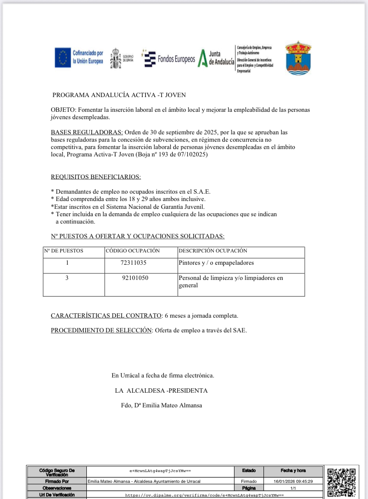 Fomentar la inserción laboral en el ámbito local y mejorar la empleabilidad de las personas jóvenes desempleadas. El ayuntamiento de Urracal, es beneficiario del Programa de Empleo "Activa-T Joven" de la junta de Andalucía, que permitirá la contratación de 4 puestos de trabajo, mediante contrato de 6 meses de duración.